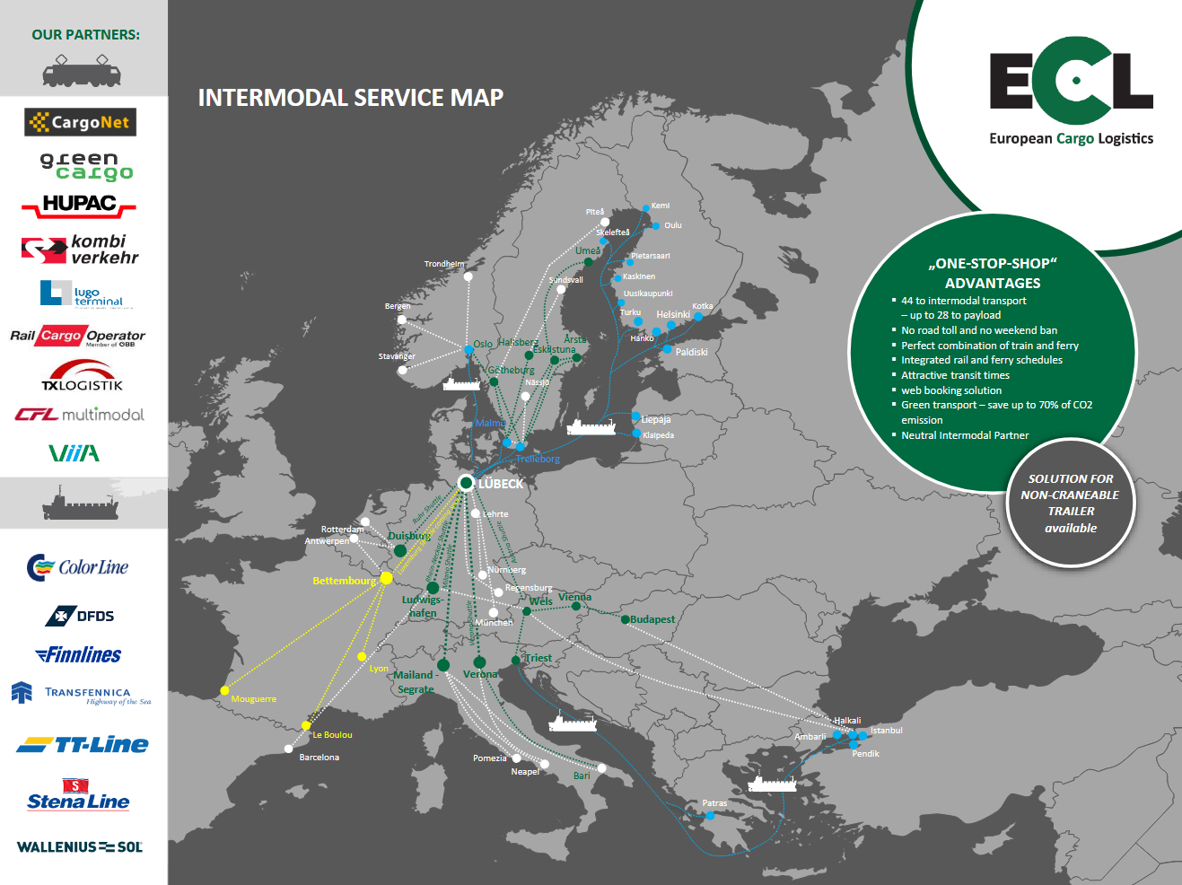 You can also order integrated rail and ferry transports by our intermodal „ONE-STOP-SHOP“ services.